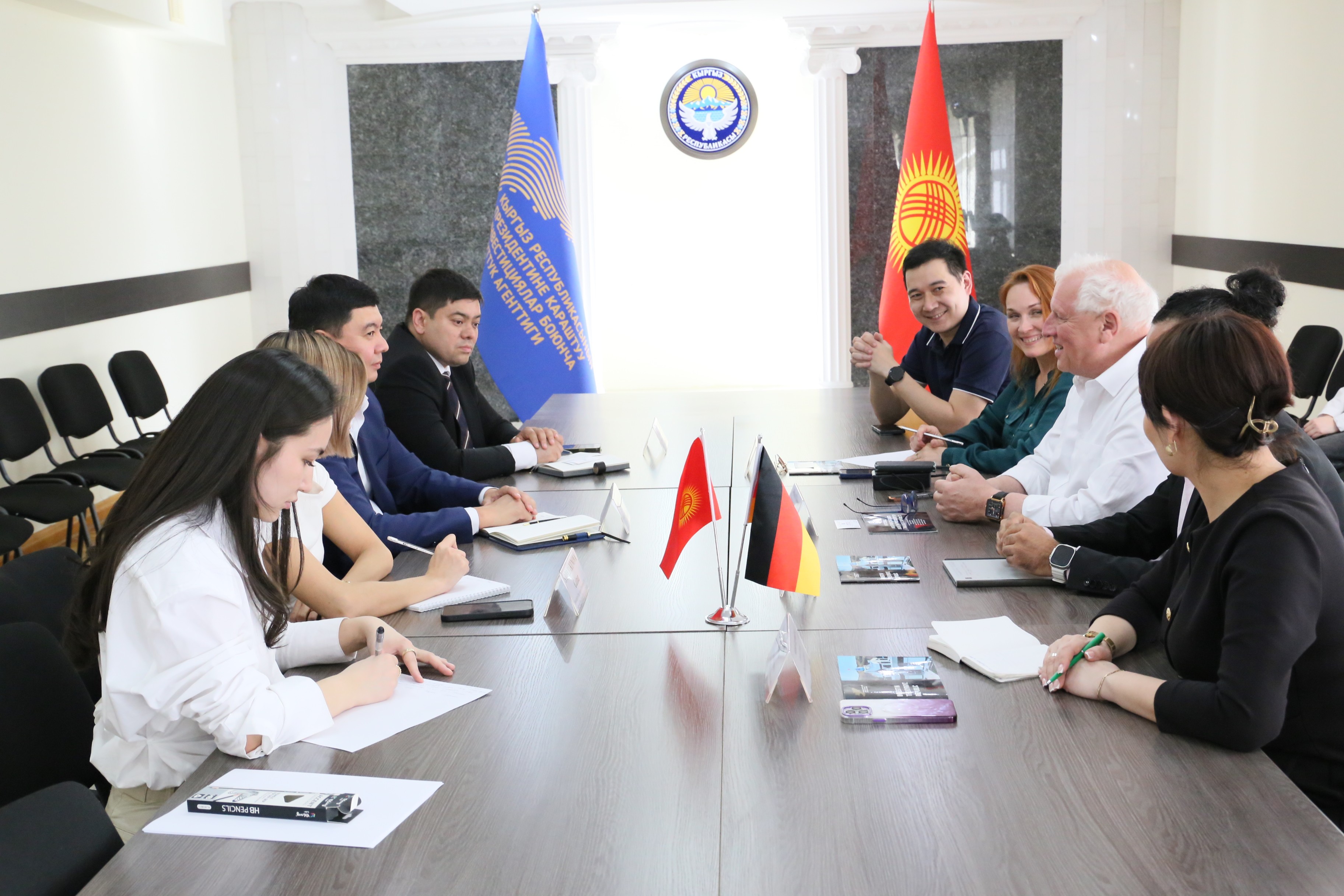 Кыргыз Республикасынын Президентине караштуу Инвестициялар боюнча улуттук агенттиктин башчысынын орун басары Мээримбек Койчуманов немис компаниясы Lenus Health GmbHнин делегация башчысы Сам Азими, German Global Trade Forum Berlin уюмунун өкүлдөрү, China Forum Berlin жетекчиси Эберхард Й. Тремпель жана Борбор Азия боюнча өкүлү Наталья Ленчанка, ошондой эле ОсОО «МедФарм Консалтинг» компаниясынын башкы директору Айзада Арзыматова менен жолугушту. Жолугушуунун жүрүшүндө фармацевтика, медициналык буюмдар жана биологиялык активдүү кошулмалар тармагындагы кызматташуунун келечектүү багыттары, ошондой эле эркин экономикалык аймактардын жана мамлекеттик-жеке өнөктөштүктүн механизмдерин колдонуу аркылуу инвестициялык долбоорлорду ишке ашыруу мүмкүнчүлүктөрү талкууланды. Белгиленгендей, Кыргыз Республикасы Бирдиктүү бажы мейкиндигин жана медициналык буюмдар менен фармацевтикалык продукциялардын жалпы рыногун эске алуу менен Евразия экономикалык бирлигинин рыногуна чыгуу үчүн ыңгайлуу аянтча болуп саналат. Германия тарапка инвесторлорду колдоонун иштеп жаткан инструменттери тууралуу маалыматтар берилди, анын ичинде мамлекеттик-жеке өнөктөштүк принциптеринин негизинде долбоорлорду ишке ашыруу механизмдери, алардын артыкчылыктары жана практикалык колдонулушу түшүндүрүлдү. Жыйынтыгында тараптар мындан аркы кызматташууну өнүктүрүүгө жана биргелешкен долбоорлорду ишке ашырууга кызыкдар экенин билдирип, ошондой эле ишкер байланыштарды кеңейтүү жана биргелешкен демилгелерди илгерилетүү максатында кийинки кыргыз-герман бизнес-форумуна катышууга ниеттерин айтышты.